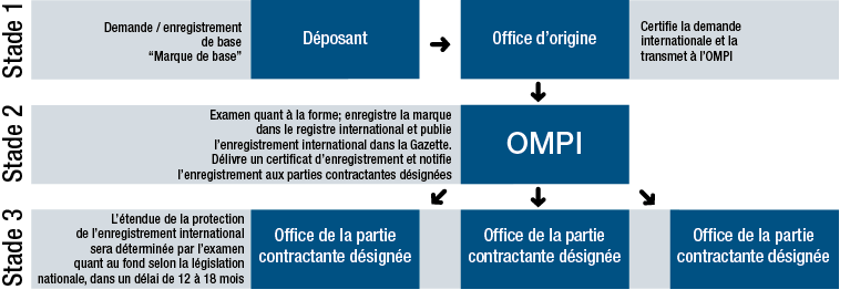 Il existe cinq étapes principales dans la procédure de dépôt d’une demande internationale d’enregistrement de marque par l’intermédiaire du système de Madrid de l’OMPI :
