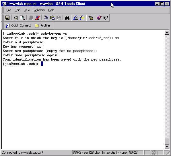 - Lftp requires the use of an unprotected private key file in the user ".ssh" directory. If your current OpenSSH private key is protected, you may unprotect it with the "ssh-keygen" application. First, cd to the ".ssh" directory. Then, type "ssh-keygen p" and follow the instructions as shown below. Enter your account name as the file name. You will be prompted for your existing passphrase. You may then change the passphrase to empty.