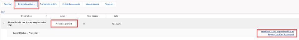 Where status of protection is “Protection Granted”, you can directly download a PDF document showing a status summary. If you need something more official, you can quickly order a certified document.