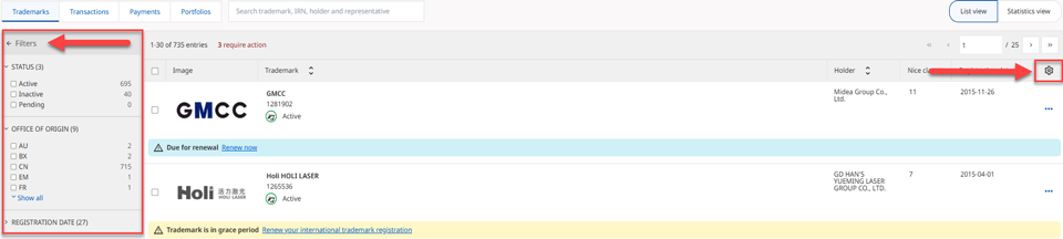 - Search for the missing international trademark registration(s) that you hold or manage by name or number