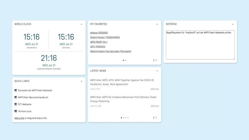 Die fünf generischen Widgets wurden entwickelt, um Ihr Gesamterlebnis bei der Nutzung der Online-IP-Dienste der WIPO zu verbessern. Sie sind konfigurierbar und bieten einfachen Zugriff auf Weltzeituhren, aktuelle Nachrichten, schnelle Links, Ihre bevorzugten WIPO-Online-Dienste sowie einen Merkzettel.