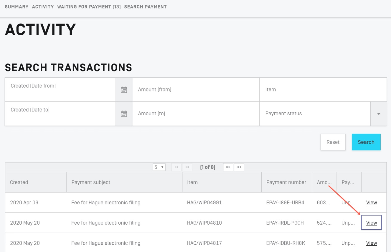 The "Filed application(s)" tab allows you to retrieve and view all the online applications you have previously filed by means of the eHague interface.