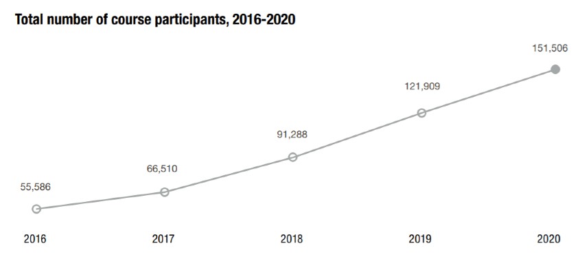 The Academy’s participation rates show a continuing increase, with a 24 percent growth in demand compared to 2019, and 175 percent since 2016, having reached nearly 152,000 participants from all WIPO Member States in 2020.