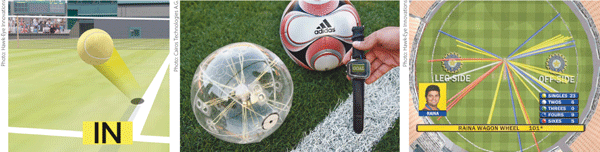 Images are processed by a bank of computers in real time and sent to a central computer programmed to analyze a predefined playing area according to the rules of the game. This information is used to determine whether a ball has crossed a line or other rules have been infringed. In each frame sent from each camera, the system identifies the cluster of pixels that corresponds to the image of the ball. It calculates for each frame the three-dimensional position of the ball by comparing its position at the same instant in time on a least two cameras placed in different locations. A succession of frames builds up a record of the path along which the ball has travelled. The system generates a graphic image of the ball’s path and the playing area in real time and this information is readily available to judges, television viewers and coaching staff.