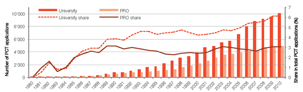 Figure 1: Universities’ and PROs’ patents are increasing under the PCT. PCT applications from PROs and