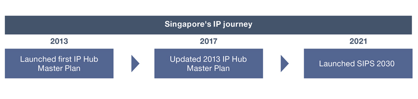 Building on the IP Hub Master plan and its revision, in 2021, the Singapore Government launched the Singapore IP Strategy 2030 (SIPS 2030). It focuses on three key areas. First, it seeks to strengthen Singapore’s position as a global hub for IP activities and transactions; second, it aims to attract and grow innovative enterprises; and third, it strives to develop good jobs and skills in IP.