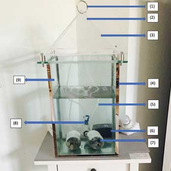 - Se llena el recipiente de cristal con agua de mar o una mezcla de agua destilada y sal.