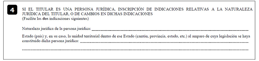 Anteriormente, la naturaleza jurídica del titular y el territorio en el que está constituida la entidad jurídica solo podían indicarse en la solicitud internacional, en la designación posterior o en una petición de cambio en la titularidad (formulario MM5).