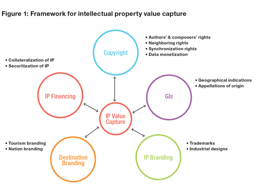 Investment in the IP value embedded in the creative industries presents a number of opportunities. In particular, in terms of copyright and related rights income, for example, from the exploitation of authors’ neighboring and synchronization rights. IP value capture in the creative sector does not stop there. Used strategically, IP rights can generate economic value in sectors like tourism (through destination and nation branding), manufacturing (through the use of geographical indications, appellations of origin, and own-brand manufacturing), and information and communication technologies (ICTs) (through ecommerce, media value, and data monetization). IP assets can also be used as collateral or security to finance the development of creative industries (see Figure 1 below).