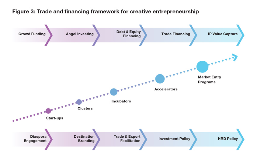 From this standpoint, the provision of end-to-end business solutions and trade and financing support mechanisms would go a long way toward improving the export competitiveness of the sector. Implementing this approach would involve the development of start-ups hubs or camps, sector clusters, and incubators or accelerators for innovation-driven enterprises that are directly linked to market entry programs and new financing mechanisms such as crowdfunding, angel investing and venture capital, along with traditional debt and equity financing. Such measures need to be backed up by an array of strategic policy support measures, which could include diaspora engagement, destination branding, trade and export facilitation, investment policy and human resource development (see Figure 3).