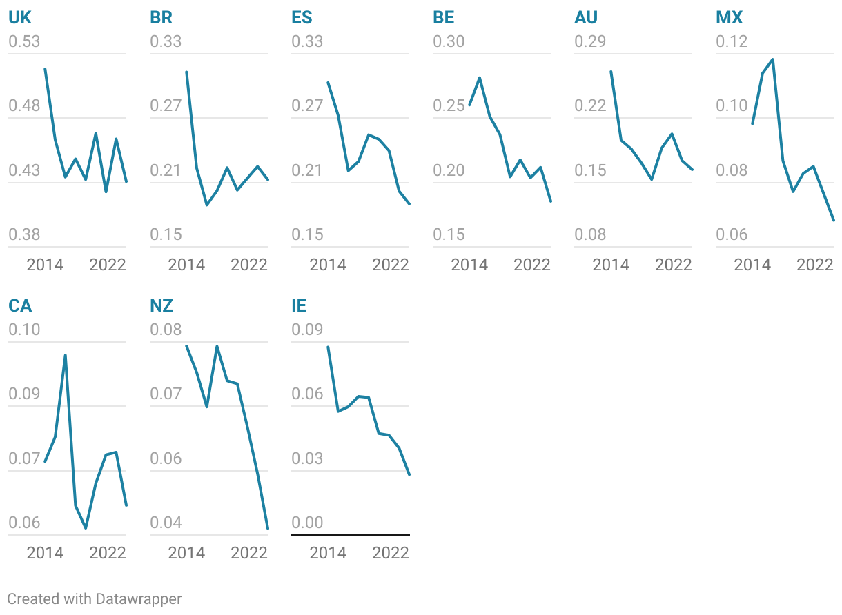 Countries such as Japan, Italy, Germany, and South Africa have experienced increased consumption of locally produced music, strengthening their domestic music industries. In contrast, nations like the United Kingdom, Brazil, Spain, Belgium, Australia, and Mexico have declined local music consumption, indicating a shift toward internationally dominant repertoire. Moreover, countries display different levels of glocalization, with Japan and the U.S. leading, while Ireland, New Zealand, and Canada show lower levels of local music consumption.