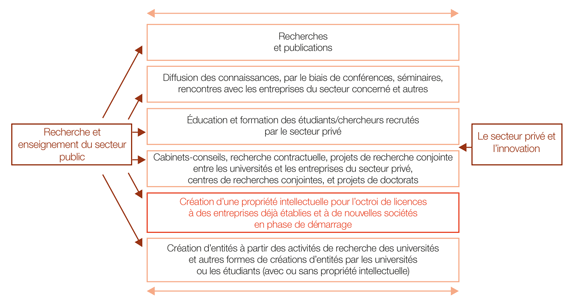 Les transferts de connaissances entre les secteurs public et privé s'effectuent par le biais d'un grand nombre de canaux de communication formels (collaboration de recherches, octroi de licences pour des inventions des universités, cœntreprises et recrutement d'étudiants et de chercheurs des universités, etc.) et de canaux informels (publications et conférences entre autres). La propriété intellectuelle peut également jouer un rôle clé en termes de stimulation de l'innovation et de création d'entreprises, notamment, par le biais de pépinières d'entreprises, de parcs scientifiques et d'entités créées à partir des activités des universités.