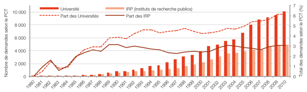 Pour la période 1980‑2010, les données montrent que les brevets délivrés aux universités et aux organismes publics de recherche se situent essentiellement dans les secteurs des sciences biomédicales et pharmaceutiques. Les États‑Unis d'Amérique se situent en première position car leurs universités et leurs organismes publics de recherche ont déposé 52 303 et 12 698 demandes internationales de brevets, respectivement. La France arrive en deuxième position avec 9068 demandes internationales de brevets déposées par ses organismes publics de recherche, suivie immédiatement du Japon avec 6850 demandes de brevet. Dans les pays à revenu intermédiaire, les universités chinoises ouvrent la voie avec 2348 demandes internationales de brevets, suivie du Brésil, de l'Inde et de l'Afrique du Sud. La Chine et l'Inde à elles deux représentent 78% du nombre de demandes internationales de brevets déposés par les organismes publics de recherches dans les pays à revenu intermédiaire.