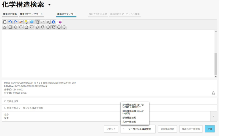 マーカッシュ定義内の「構造完全一致検索」は、ブール論理(Boolean logic)を使用して他の検索条件やロジックと組み合わせることもできます。実装されているマーカッシュ検索機能は、エキスパート機能(部分構造マーカッシュ検索、あいまいマーカッシュ検索)も提供しています。ただし、これは有料の専門的なシステムで提供されている複雑な検索基準を導入したものであり、いくらかの制限(特に応答時間)があります。