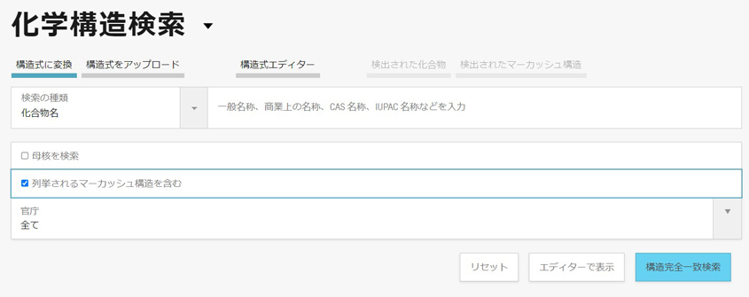 マーカッシュ検索は、PATENTSCOPEで利用でき、ログインしたユーザーは無料で利用できます。マーカッシュの構造式はClarivate社が保有し、WIPOにライセンス供与しています。マーカッシュ検索機能は、DeepMatterグループの一員であるInfochem社が実装しています。