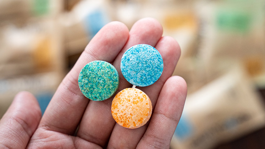 Lee氏の会社では、乾燥させたこの家庭清掃用タブレットによって、プラスチック包装を90%削減し、輸送時の体積と重量を減らすことにより、二酸化炭素排出量の削減につなげたいと考えています。「消費者の懐にも地球にも優しい循環型モデルです」と、Lee氏は説明します。