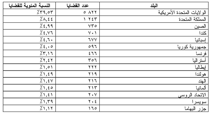القضايا المودعة لدى الويبو بحسب بلد المدّعي