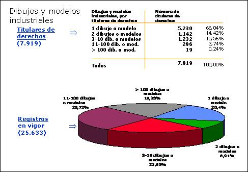 A finales de 2010, estaban en vigor 25.633 registros que contenían 107.834 dibujos y modelos industriales vigentes. El número de titulares de derechos totalizó 7.919, es decir, se produjo un aumento del 2,5% con respecto a 2009. La mayor parte de los titulares de derechos (el 96,02%) posee una cartera de registros que se eleva, como máximo, a 10 dibujos y modelos, y ello demuestra el amplio uso del sistema por las pequeñas y medianas empresas (Cuadro 5).