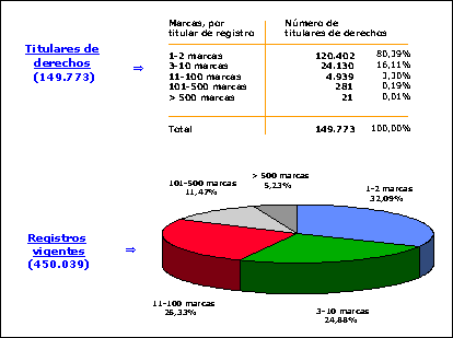 A finales de 2005 figuraban inscritos en el Registro Internacional 450.039 registros internacionales de marcas, que contenían cerca de 5,1 millones de designaciones reales y que pertenecen a cerca 150.000 titulares de registros (muchos de ellos, Pymes). Dichos registros internacionales equivalen a unos 5,1 millones de registros nacionales, habida cuenta de que, por término medio, cada registro internacional surte efecto en 11 ó 12 países designados.