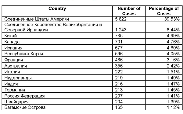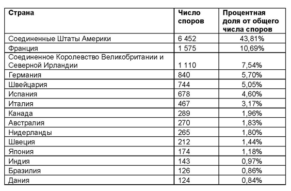 С момента вступления в действие ЕПУС в декабре 1999 г. по декабрь 2008 г. Центр ВОИС принял к рассмотрению по процедуре ЕПУС или на ее основе 14 663 жалобы (в отношении рДВУ и ксДВУ), касающихся 26 262 отдельных доменных имен. В одном только 2008 г. стороны в спорах, рассматриваемых ВОИС, представляли свыше 100 стран, что отражает действительный глобальных масштаб этого механизма урегулирования споров. Странами происхождения истцов чаще всего были Соединенные Штаты Америки (США), Франция, Соединенное Королевство, Германия, Швейцария и Испания, а ответчиков – США, Соединенное Королевство, Китай, Испания, Канада и Франция (см. Таблицу 2).