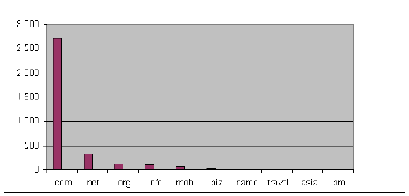 В 2008 г. разбирательства ВОИС по-прежнему чаще всего проводились на английском языке (86%), что в значительной степени связано с тем, что подавляющее большинство оспариваемых доменных имен было зарегистрировано регистраторами, базирующимися в США. Споры также рассматривались на 12 других языках, включая (в порядке убывания) испанский, французский, голландский, немецкий, китайский, корейский, японский, итальянский, румынский, русский, иврит и португальский языки. В подавляющем числе случаев оспариваемые доменные имена были выражены кодом ASCII, а небольшое число имен – кодами для китайского, французского, иврита, испанского и шведского языков. Лидером с точки зрения числа доменных имен, которые фигурировали в жалобах, поданных в ВОИС, по-прежнему оставался рДВУ «.com» (79%) (см. Таблицу 3).