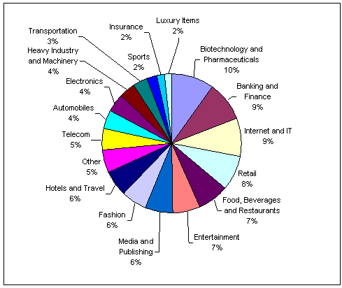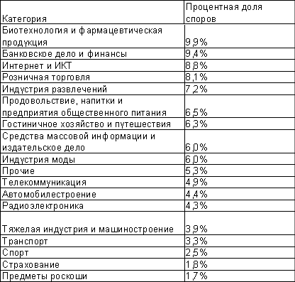 Самыми многочисленными среди истцов были представители следующих пяти областей деловой деятельности – биотехнология и фармацевтическая продукция, банковское дело и финансы, Интернет и ИТ, розничная торговля и продукты питания, напитки и общественное питание (см. Таблицу 5). Как и в 2007 г., больше всего жалоб по-прежнему подается производителями фармацевтической продукции в связи с многочисленными пермутациями охраняемых имен для целей регистрации веб-сайта, в предлагающих к онлайновой продаже медикаменты и лекарственные препараты, или содержащих отсылки на сайты электронной торговли.