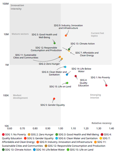 A matriz de maturidade da inovação para patentes que contribuem para os ODS destaca as áreas que vêm despertando maior interesse, no sentido de que apresentam grande número de patentes e crescimento vigoroso nos últimos anos. A ferramenta também ajuda a identificar interesses emergentes em áreas que passam despercebidas quando se considera apenas o número absoluto de patentes, pois são ofuscadas pelos segmentos com grande volume de patentes.