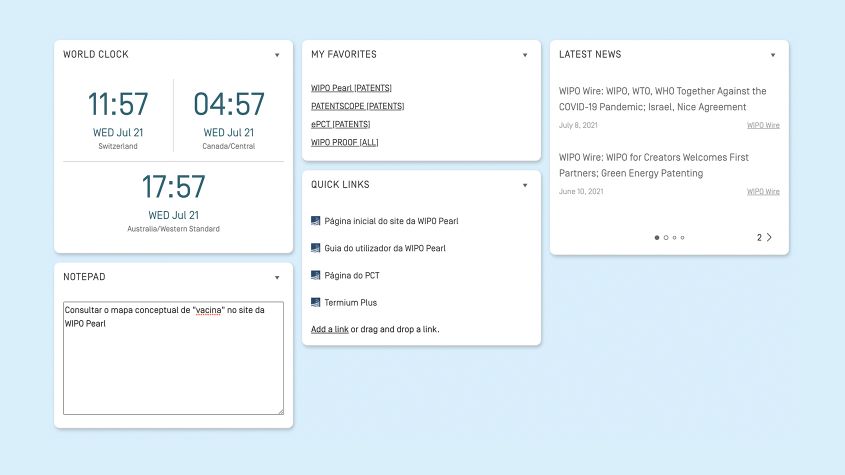 Os cinco widgets genéricos foram projetados para melhorar a sua experiência geral ao usar os serviços de PI online da OMPI. Os serviços são personalizáveis e fornecem fácil acesso a relógios mundiais, novidades, links rápidos, os seus serviços online da OMPI preferidos e um bloco de notas.