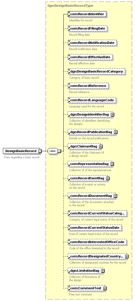 | children | com:RecordIdentifier com:RecordFilingDate com:RecordNotificationDate com:RecordEffectiveDate dgn:DesignBasicRecordCategory com:RecordReference com:RecordLanguageCode dgn:DesignIdentifierBag dgn:RecordPublicationBag dgn:ClaimantBag com:RepresentativeBag com:RecordEventBag com:RecordDocumentBag com:RecordCurrentStatusCategory com:RecordCurrentStatusDate com:RecordInterestedOfficeCode com:RecordDesignatedCountryCodeBag dgn:LimitationBag com:CommentText | ||||