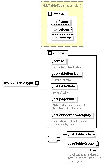 </xsd:sequence> <xsd:attribute ref="com:id"/> <xsd:attribute ref="pat:tableNumber" use="required"/> <xsd:attribute ref="pat:tableStyle" use="required"/> <xsd:attribute ref="pat:pageWide"/> <xsd:attribute ref="pat:orientationCategory"/> </xsd:extension> |