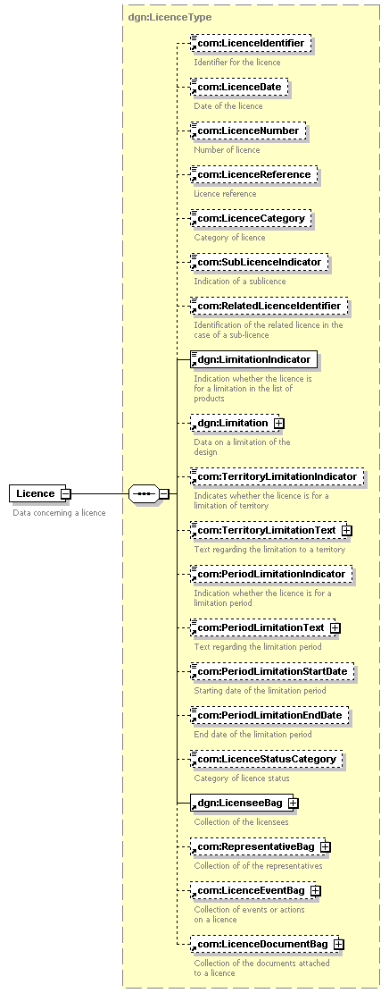 | children | com:LicenceIdentifier com:LicenceDate com:LicenceNumber com:LicenceReference com:LicenceCategory com:SubLicenceIndicator com:RelatedLicenceIdentifier dgn:LimitationIndicator dgn:Limitation com:TerritoryLimitationIndicator com:TerritoryLimitationText com:PeriodLimitationIndicator com:PeriodLimitationText com:PeriodLimitationStartDate com:PeriodLimitationEndDate com:LicenceStatusCategory dgn:LicenseeBag com:RepresentativeBag com:LicenceEventBag com:LicenceDocumentBag | ||