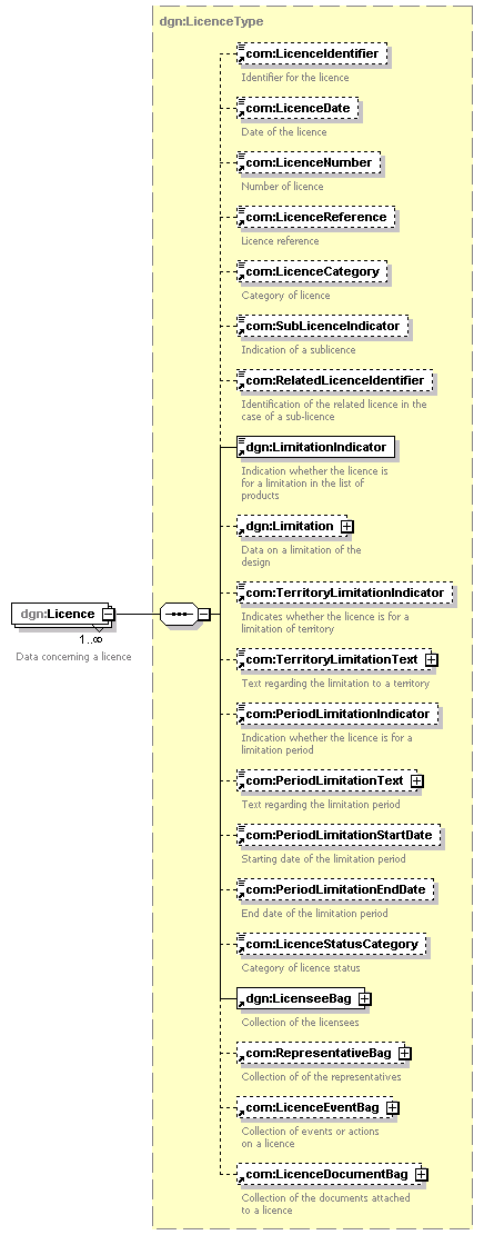 | children | com:LicenceIdentifier com:LicenceDate com:LicenceNumber com:LicenceReference com:LicenceCategory com:SubLicenceIndicator com:RelatedLicenceIdentifier dgn:LimitationIndicator dgn:Limitation com:TerritoryLimitationIndicator com:TerritoryLimitationText com:PeriodLimitationIndicator com:PeriodLimitationText com:PeriodLimitationStartDate com:PeriodLimitationEndDate com:LicenceStatusCategory dgn:LicenseeBag com:RepresentativeBag com:LicenceEventBag com:LicenceDocumentBag | ||