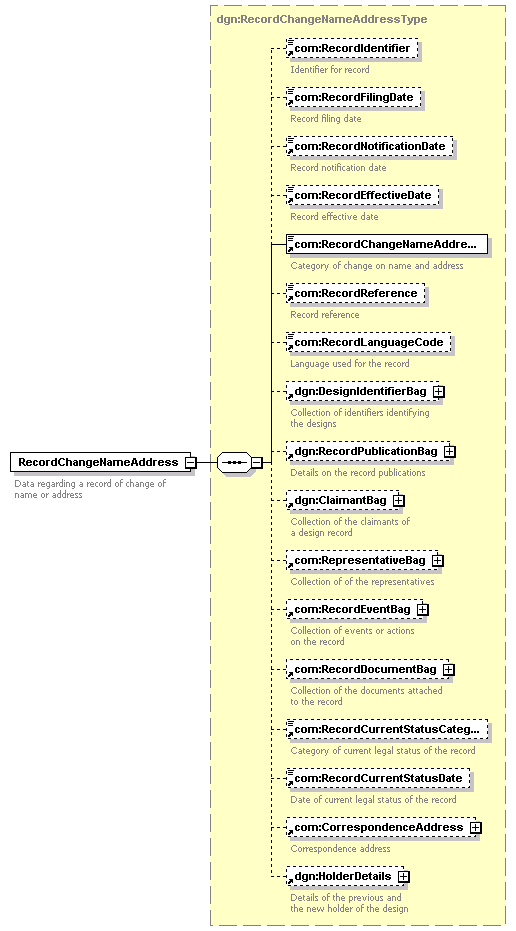 | children | com:RecordIdentifier com:RecordFilingDate com:RecordNotificationDate com:RecordEffectiveDate com:RecordChangeNameAddressCategory com:RecordReference com:RecordLanguageCode dgn:DesignIdentifierBag dgn:RecordPublicationBag dgn:ClaimantBag com:RepresentativeBag com:RecordEventBag com:RecordDocumentBag com:RecordCurrentStatusCategory com:RecordCurrentStatusDate com:CorrespondenceAddress dgn:HolderDetails | ||||