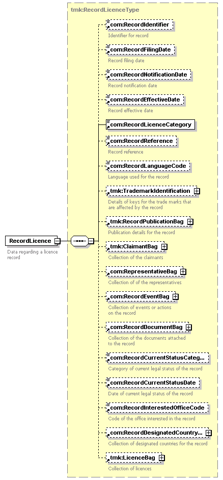| children | com:RecordIdentifier com:RecordFilingDate com:RecordNotificationDate com:RecordEffectiveDate com:RecordLicenceCategory com:RecordReference com:RecordLanguageCode tmk:TrademarkIdentification tmk:RecordPublicationBag tmk:ClaimantBag com:RepresentativeBag com:RecordEventBag com:RecordDocumentBag com:RecordCurrentStatusCategory com:RecordCurrentStatusDate com:RecordInterestedOfficeCode com:RecordDesignatedCountryCodeBag tmk:LicenceBag | ||||