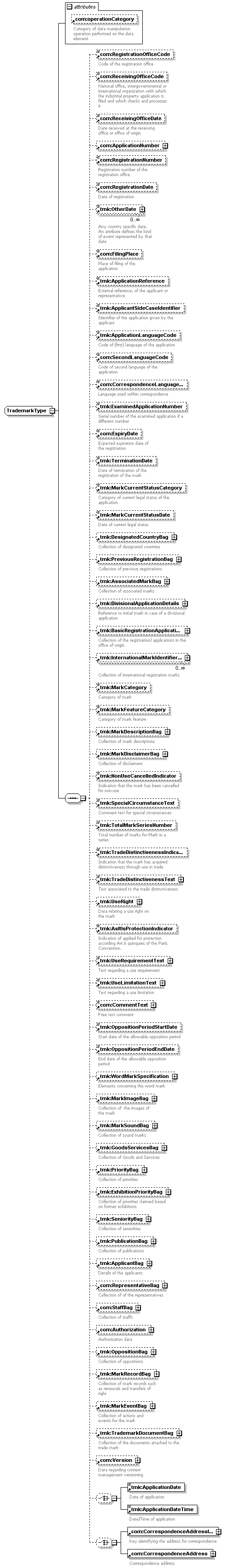 com:RegistrationOfficeCode com:ReceivingOfficeCode com:ReceivingOfficeDate com:ApplicationNumber com:RegistrationNumber com:RegistrationDate tmk:OtherDate com:FilingPlace tmk:ApplicationReference tmk:ApplicantSideCaseIdentifier tmk:ApplicationLanguageCode com:SecondLanguageCode com:CorrespondenceLanguageCode tmk:ExaminedApplicationNumber com:ExpiryDate tmk:TerminationDate tmk:MarkCurrentStatusCategory tmk:MarkCurrentStatusDate tmk:DesignatedCountryBag tmk:PreviousRegistrationBag tmk:AssociatedMarkBag tmk:DivisionalApplicationDetails tmk:BasicRegistrationApplicationBag tmk:InternationalMarkIdentifierBag tmk:MarkCategory tmk:MarkFeatureCategory tmk:MarkDescriptionBag tmk:MarkDisclaimerBag tmk:NonUseCancelledIndicator tmk:SpecialCircumstanceText tmk:TotalMarkSeriesNumber tmk:TradeDistinctivenessIndicator tmk:TradeDistinctivenessText tmk:UseRight tmk:AsItIsProtectionIndicator tmk:UseRequirementText tmk:UseLimitationText com:CommentText tmk:OppositionPeriodStartDate tmk:OppositionPeriodEndDate tmk:WordMarkSpecification tmk:MarkImageBag tmk:MarkSoundBag tmk:GoodsServicesBag tmk:PriorityBag tmk:ExhibitionPriorityBag tmk:SeniorityBag tmk:PublicationBag tmk:ApplicantBag com:RepresentativeBag com:StaffBag com:Authorization tmk:OppositionBag tmk:MarkRecordBag tmk:MarkEventBag tmk:TrademarkDocumentBag com:Version tmk:ApplicationDate tmk:ApplicationDateTime com:CorrespondenceAddressIdentification com:CorrespondenceAddress |
