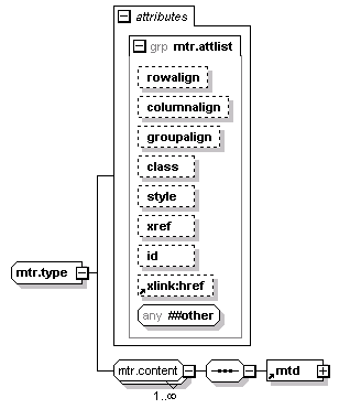 | source | <xsd:complexType name="mtr.type"> <xsd:group ref="mtr.content" minOccurs="1" maxOccurs="unbounded"/> <xsd:attributeGroup ref="mtr.attlist"/> </xsd:complexType> |