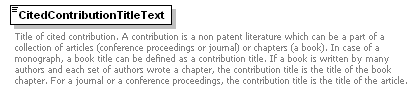 <xsd:documentation> Title of cited contribution. A contribution is a non patent literature which can be a part of a collection of articles (conference proceedings or journal) or chapters (a book). In case of a monograph, a book title can be defined as a contribution title. If a book is written by many authors and each set of authors wrote a chapter, the contribution title is the title of the book chapter. For a journal or a conference proceedings, the contribution title is the title of the article. </xsd:documentation> |