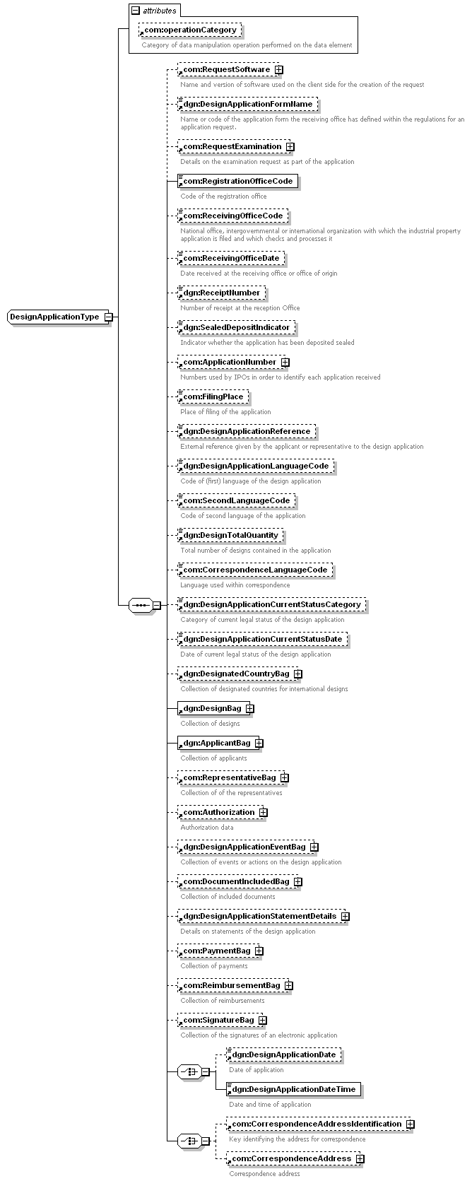 com:RequestSoftware dgn:DesignApplicationFormName com:RequestExamination com:RegistrationOfficeCode com:ReceivingOfficeCode com:ReceivingOfficeDate dgn:ReceiptNumber dgn:SealedDepositIndicator com:ApplicationNumber com:FilingPlace dgn:DesignApplicationReference dgn:DesignApplicationLanguageCode com:SecondLanguageCode dgn:DesignTotalQuantity com:CorrespondenceLanguageCode dgn:DesignApplicationCurrentStatusCategory dgn:DesignApplicationCurrentStatusDate dgn:DesignatedCountryBag dgn:DesignBag dgn:ApplicantBag com:RepresentativeBag com:Authorization dgn:DesignApplicationEventBag com:DocumentIncludedBag dgn:DesignApplicationStatementDetails com:PaymentBag com:ReimbursementBag com:SignatureBag dgn:DesignApplicationDate dgn:DesignApplicationDateTime com:CorrespondenceAddressIdentification com:CorrespondenceAddress |