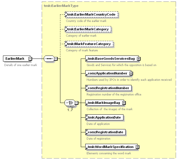 | children | tmk:EarlierMarkCountryCode tmk:EarlierMarkCategory tmk:MarkFeatureCategory tmk:BaseGoodsServicesBag com:ApplicationNumber com:RegistrationNumber tmk:MarkImageBag tmk:ApplicationDate com:RegistrationDate tmk:WordMarkSpecification | ||||
