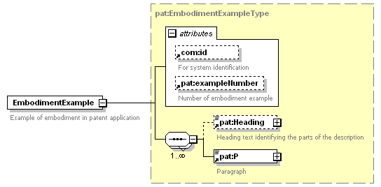 | source | <xsd:element name="EmbodimentExample" type="pat:EmbodimentExampleType"> <xsd:annotation>