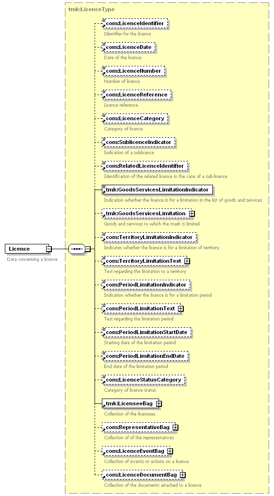 | children | com:LicenceIdentifier com:LicenceDate com:LicenceNumber com:LicenceReference com:LicenceCategory com:SublicenceIndicator com:RelatedLicenceIdentifier tmk:GoodsServicesLimitationIndicator tmk:GoodsServicesLimitation com:TerritoryLimitationIndicator com:TerritoryLimitationText com:PeriodLimitationIndicator com:PeriodLimitationText com:PeriodLimitationStartDate com:PeriodLimitationEndDate com:LicenceStatusCategory tmk:LicenseeBag com:RepresentativeBag com:LicenceEventBag com:LicenceDocumentBag | ||||