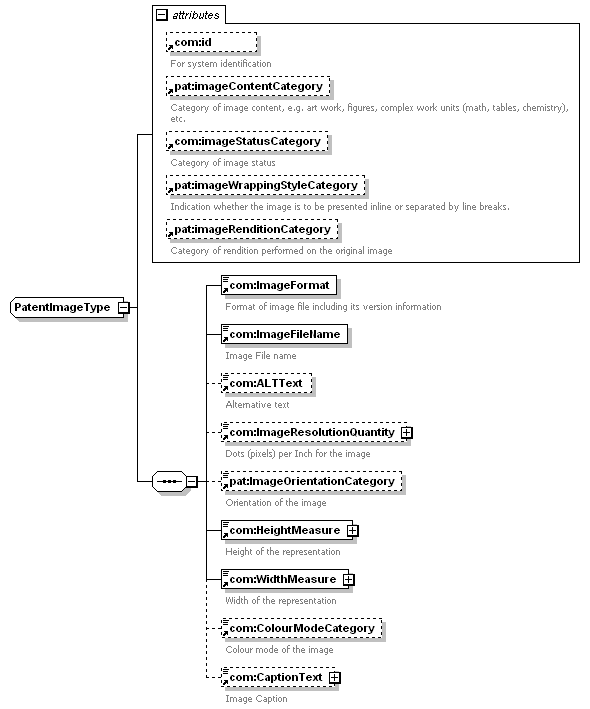 </xsd:sequence> <xsd:attribute ref="com:id"/> <xsd:attribute ref="pat:imageContentCategory"/> <xsd:attribute ref="com:imageStatusCategory"/> <xsd:attribute ref="pat:imageWrappingStyleCategory"/> <xsd:attribute ref="pat:imageRenditionCategory"/> </xsd:complexType> |