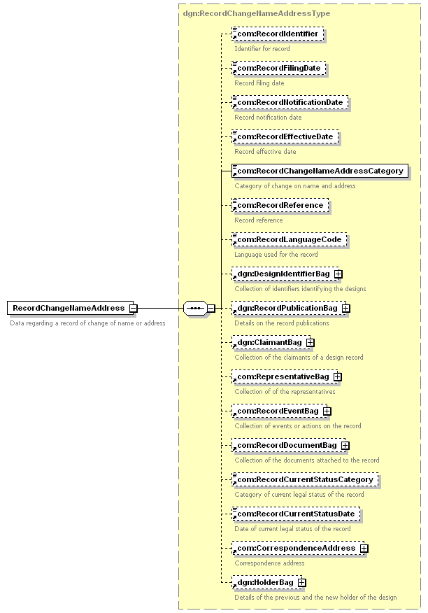 | children | com:RecordIdentifier com:RecordFilingDate com:RecordNotificationDate com:RecordEffectiveDate com:RecordChangeNameAddressCategory com:RecordReference com:RecordLanguageCode dgn:DesignIdentifierBag dgn:RecordPublicationBag dgn:ClaimantBag com:RepresentativeBag com:RecordEventBag com:RecordDocumentBag com:RecordCurrentStatusCategory com:RecordCurrentStatusDate com:CorrespondenceAddress dgn:HolderBag | ||||