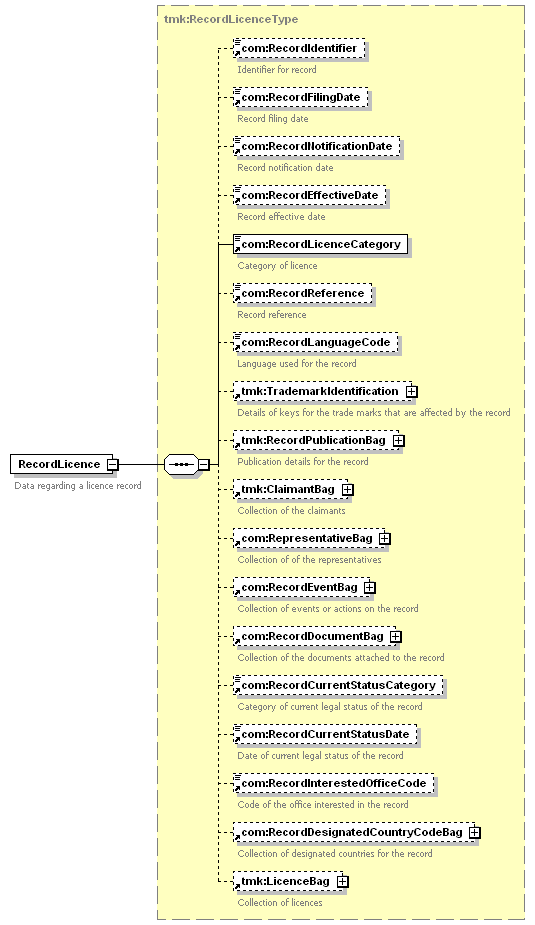 | children | com:RecordIdentifier com:RecordFilingDate com:RecordNotificationDate com:RecordEffectiveDate com:RecordLicenceCategory com:RecordReference com:RecordLanguageCode tmk:TrademarkIdentification tmk:RecordPublicationBag tmk:ClaimantBag com:RepresentativeBag com:RecordEventBag com:RecordDocumentBag com:RecordCurrentStatusCategory com:RecordCurrentStatusDate com:RecordInterestedOfficeCode com:RecordDesignatedCountryCodeBag tmk:LicenceBag | ||||