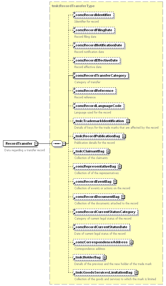 | children | com:RecordIdentifier com:RecordFilingDate com:RecordNotificationDate com:RecordEffectiveDate com:RecordTransferCategory com:RecordReference com:RecordLanguageCode tmk:TrademarkIdentification tmk:RecordPublicationBag tmk:ClaimantBag com:RepresentativeBag com:RecordEventBag com:RecordDocumentBag com:RecordCurrentStatusCategory com:RecordCurrentStatusDate com:CorrespondenceAddress tmk:HolderBag tmk:GoodsServicesLimitationBag | ||||