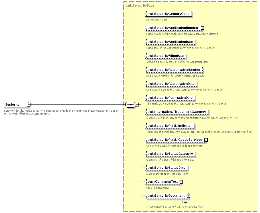 | children | tmk:SeniorityCountryCode tmk:SeniorityApplicationNumber tmk:SeniorityApplicationDate tmk:SeniorityFilingDate tmk:SeniorityRegistrationNumber tmk:SeniorityRegistrationDate tmk:SeniorityPublicationDate tmk:InternationalTrademarkCategory tmk:SeniorityPartialIndicator tmk:SeniorityPartialGoodsServices tmk:SeniorityStatusCategory tmk:SeniorityStatusDate com:CommentText tmk:SeniorityDocument | ||||