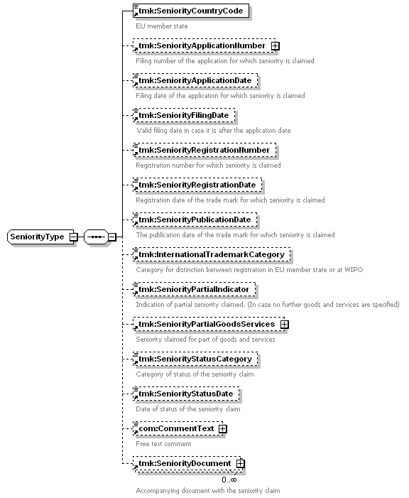 children tmk:SeniorityCountryCode tmk:SeniorityApplicationNumber tmk:SeniorityApplicationDate tmk:SeniorityFilingDate tmk:SeniorityRegistrationNumber tmk:SeniorityRegistrationDate tmk:SeniorityPublicationDate tmk:InternationalTrademarkCategory tmk:SeniorityPartialIndicator tmk:SeniorityPartialGoodsServices tmk:SeniorityStatusCategory tmk:SeniorityStatusDate com:CommentText tmk:SeniorityDocument