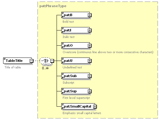 | source | <xsd:element name="TableTitle" type="pat:PhraseType"> <xsd:annotation>