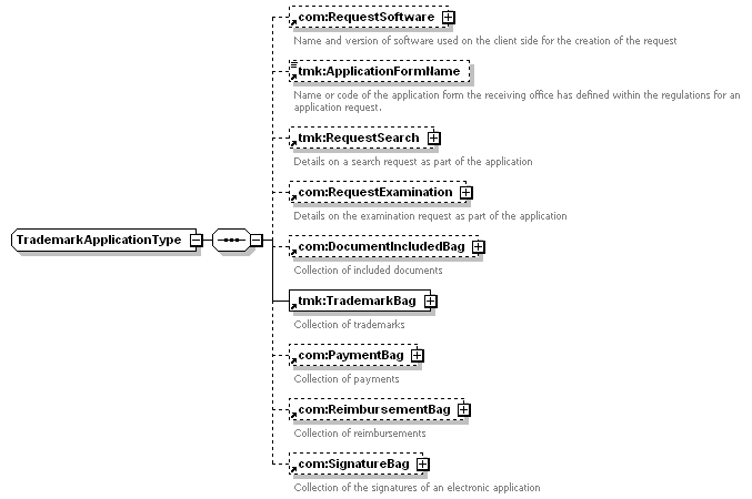 com:RequestSoftware tmk:ApplicationFormName tmk:RequestSearch com:RequestExamination com:DocumentIncludedBag tmk:TrademarkBag com:PaymentBag com:ReimbursementBag com:SignatureBag |