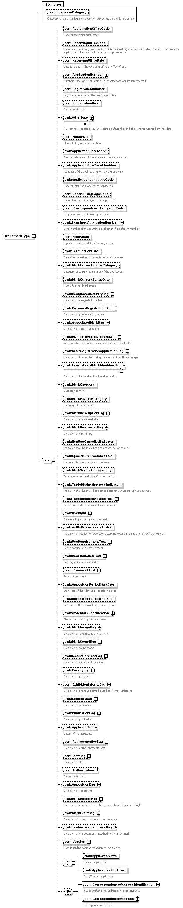com:RegistrationOfficeCode com:ReceivingOfficeCode com:ReceivingOfficeDate com:ApplicationNumber com:RegistrationNumber com:RegistrationDate tmk:OtherDate com:FilingPlace tmk:ApplicationReference tmk:ApplicantSideCaseIdentifier tmk:ApplicationLanguageCode com:SecondLanguageCode com:CorrespondenceLanguageCode tmk:ExaminedApplicationNumber com:ExpiryDate tmk:TerminationDate tmk:MarkCurrentStatusCategory tmk:MarkCurrentStatusDate tmk:DesignatedCountryBag tmk:PreviousRegistrationBag tmk:AssociatedMarkBag tmk:DivisionalApplicationDetails tmk:BasicRegistrationApplicationBag tmk:InternationalMarkIdentifierBag tmk:MarkCategory tmk:MarkFeatureCategory tmk:MarkDescriptionBag tmk:MarkDisclaimerBag tmk:NonUseCancelledIndicator tmk:SpecialCircumstanceText tmk:MarkSeriesTotalQuantity tmk:TradeDistinctivenessIndicator tmk:TradeDistinctivenessText tmk:UseRight tmk:AsItIsProtectionIndicator tmk:UseRequirementText tmk:UseLimitationText com:CommentText tmk:OppositionPeriodStartDate tmk:OppositionPeriodEndDate tmk:WordMarkSpecification tmk:MarkImageBag tmk:MarkSoundBag tmk:GoodsServicesBag tmk:PriorityBag com:ExhibitionPriorityBag tmk:SeniorityBag tmk:PublicationBag tmk:ApplicantBag com:RepresentativeBag com:StaffBag com:Authorization tmk:OppositionBag tmk:MarkRecordBag tmk:MarkEventBag tmk:TrademarkDocumentBag com:Version tmk:ApplicationDate tmk:ApplicationDateTime com:CorrespondenceAddressIdentification com:CorrespondenceAddress |